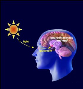 Zonlicht overdag (vooral blauw licht) onderdrukt die productie van melatonine omdat we overdag alert moeten zijn. Het helpt je biologische klok scherp te houden.  Overdag bij daglicht wordt er door je pijnappelklier (epifyse) serotonine aangemaakt en zodra het donker wordt omgezet in melatonine.